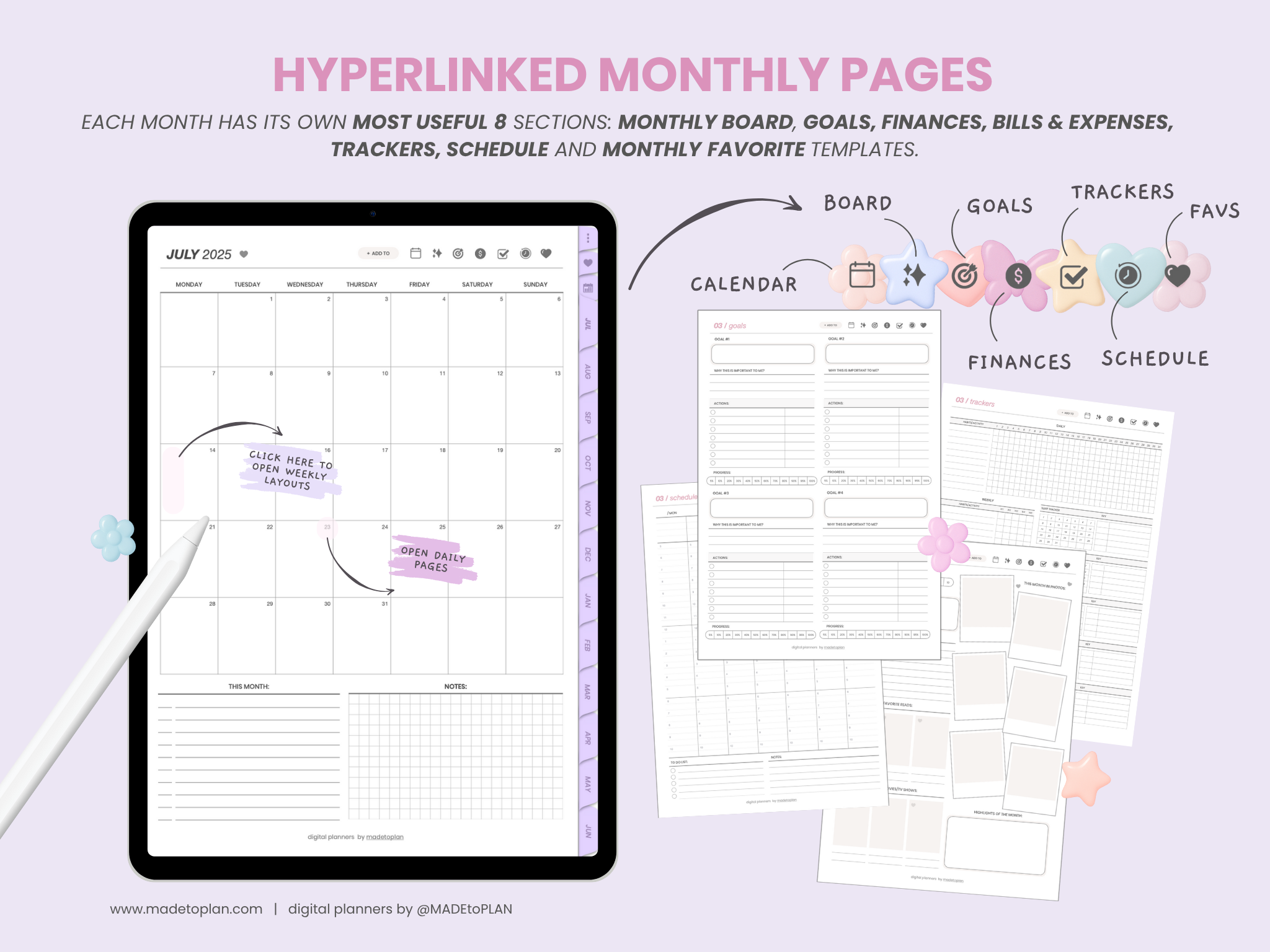 • Month-at-a-Glance Calendar, Monthly Board (Vision or Inspiration Board), NEW Monthly Goals Page, Finances Tracker (+ bills, expenses & subscriptions), Monthly Trackers & Habits, Monthly Schedule, Your Monthly Favorites